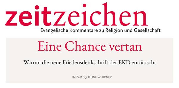 Heidelberg, 05.12.2025 - In der Zeitschrift zeitzeichen ist ein Beitrag von Ines-Jacqueline Werkner, Leiterin des Arbeitsbereiches Frieden, erschienen, in dem sie die neue Friedensdenkschrift der EKD in frn Blick nimmt und nach deren Mehrwert befragt. Die Friedensdenktschrift übernimmt die aktuellen politischen Entscheidungen und legitimiert sie ethisch.