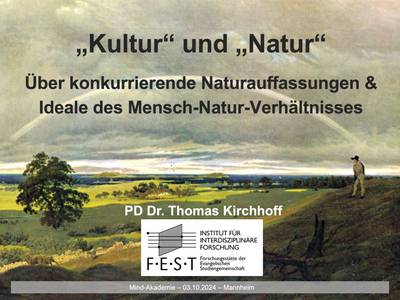 Heidelberg, 07.10.2024 - Auf der 22. Mind-Akademie in Mannheim hielt PD Dr. Thomas Kirchhoff von der FEST am 03. Oktober 2024 die Keynote, mit der er die zahlreichen Teilnehmerinnen und Teilnehmer in das Thema der diesjährigen Mind-Akademie einführte. Er referierte unter dem Titel „‘Kultur‘ und ‚Natur‘. Über konkurrierende Naturauffassungen & Ideale des Mensch-Natur-Verhältnisses“ zu unterschiedlichen Wahrnehmungsweisen, Werten und Begriffen von Natur, zu konkurrierenden Idealen hinsichtlich der Frage, in welchem Verhältnis menschliche Gesellschaften bzw. Kulturen zur Natur stehen sollen, zum Themenfeld Wildnis sowie zu der aktuellen Debatte, ob die Unterscheidung zwischen Kultur und Natur aufgegeben werden sollte.