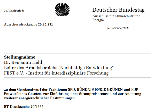 Stellungnahme Bundestagsausschuss zu Strompreisbremse