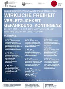 Personale Freiheit diesseits von SelbstbestimmungWas bedeutet Freiheit, wenn sie nicht allein mit Selbstbestimmung und Selbstgestaltung gleichgesetzt wird? Die interdisziplinäre Ringvorlesung widmet sich der Frage, wie personale Freiheit auch in leiblichen und alltagsnahen Ausdrucksformen erfahrbar wird – auch und vor allem unter Bedingungen von Verletzlichkeit oder Einschränkung. Im Mittelpunkt steht die Sensibilisierung für Freiheitsbegriffe/-praktiken, die über das klassische Ideal autonomer Entscheidung hinausgehen und neue Perspektiven auf die Würde und die Personalität des Menschen eröffnen.In jeder Sitzung diskutieren eingeladene Wissenschaftlerinnen und Wissenschaftler der Universitäten Heidelberg und Mannheim aktuelle Beiträge zu diesem Thema. Die Veranstaltung richtet sich an Forschende, Studierende und alle Interessierten, die sich mit philosophischen, theologischen und sozialwissenschaftlichen Fragen der Freiheit auseinandersetzen möchten.Die Veranstaltung findet online statt, um Voranmeldung wird gebeten: freiheit@fest-heidelberg.de